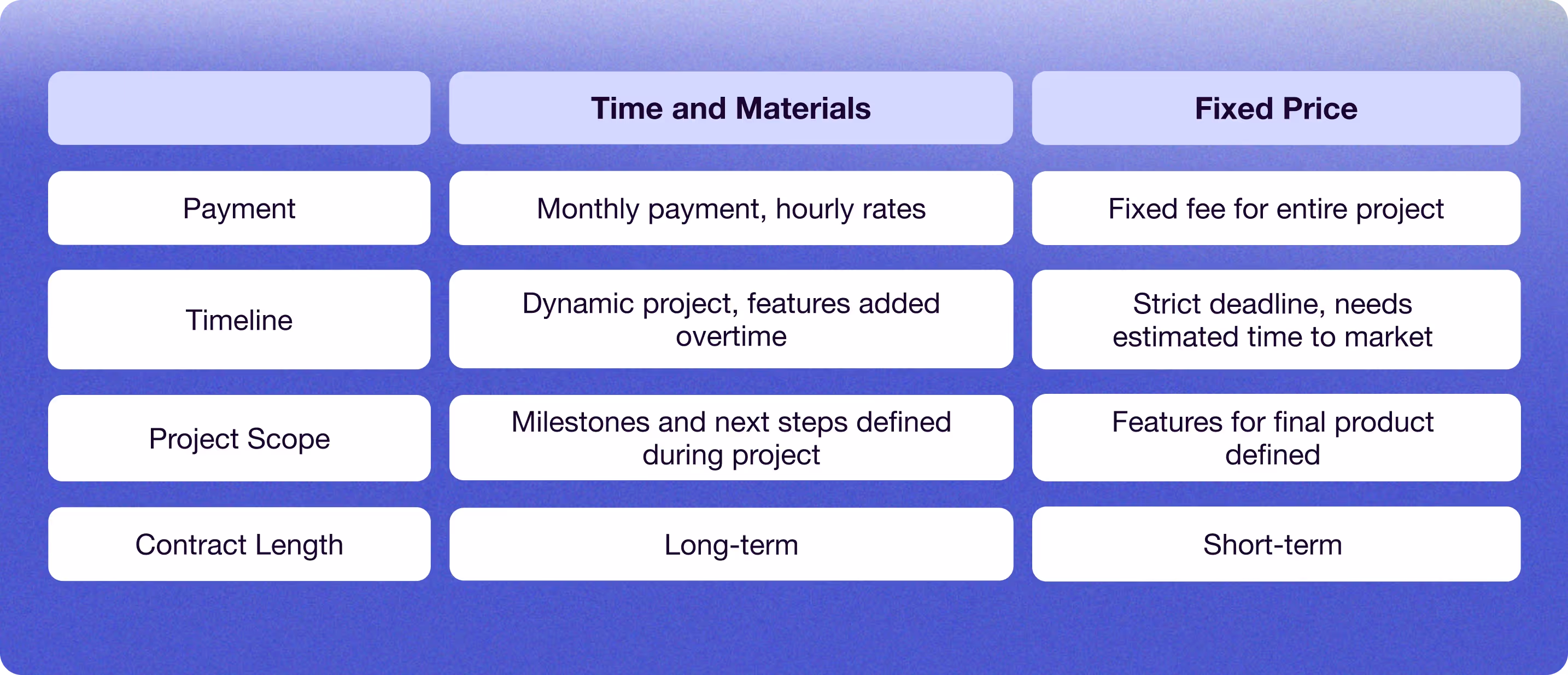 The company will need to know if the project is short-term with the majority of the features already defined, or a long-term project where the milestones and next steps will be defined throughout the project’s duration. In the case of the former, the company will likely quote a fixed fee and estimate the time to market.