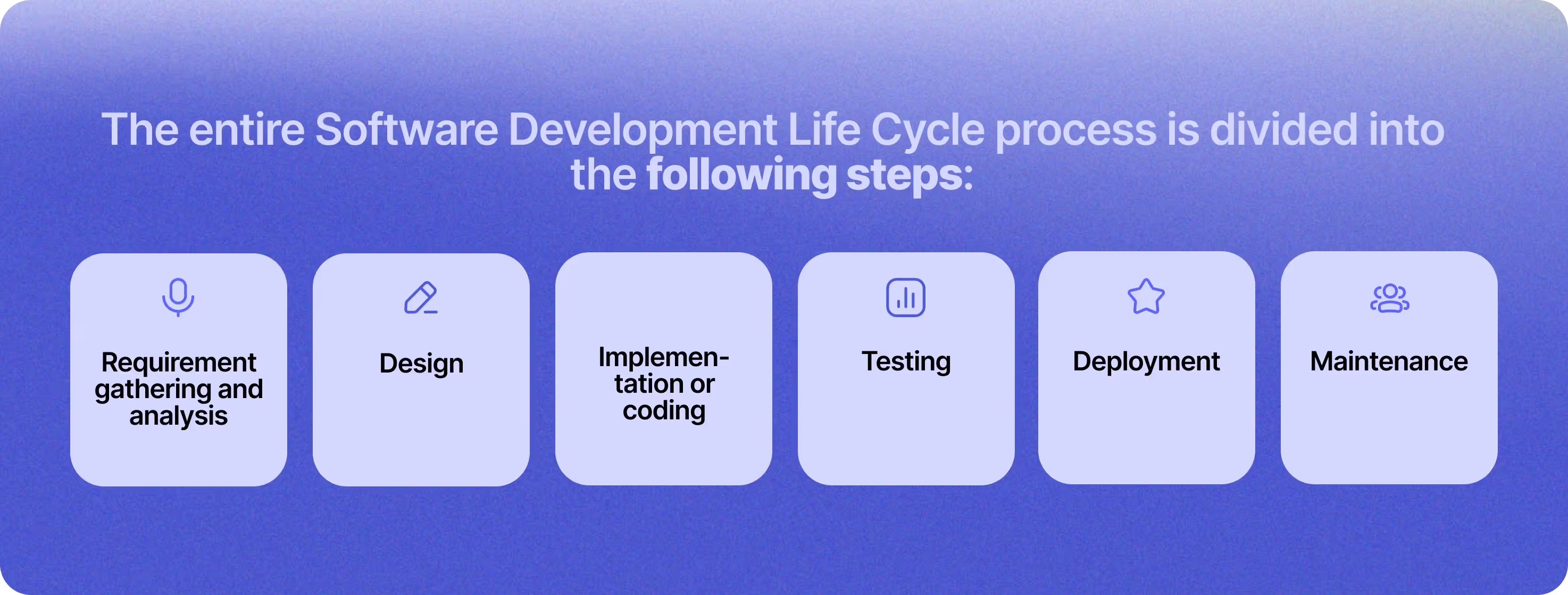 The purpose of SDLC is to deliver a high-quality product per the customer's requirement. SDLC has defined its phases: Requirement gathering, Designing, Coding, Testing, Deployment, and Maintenance.
